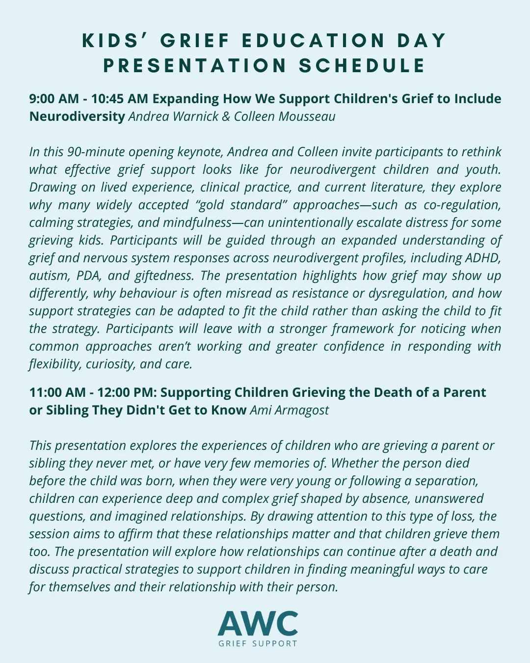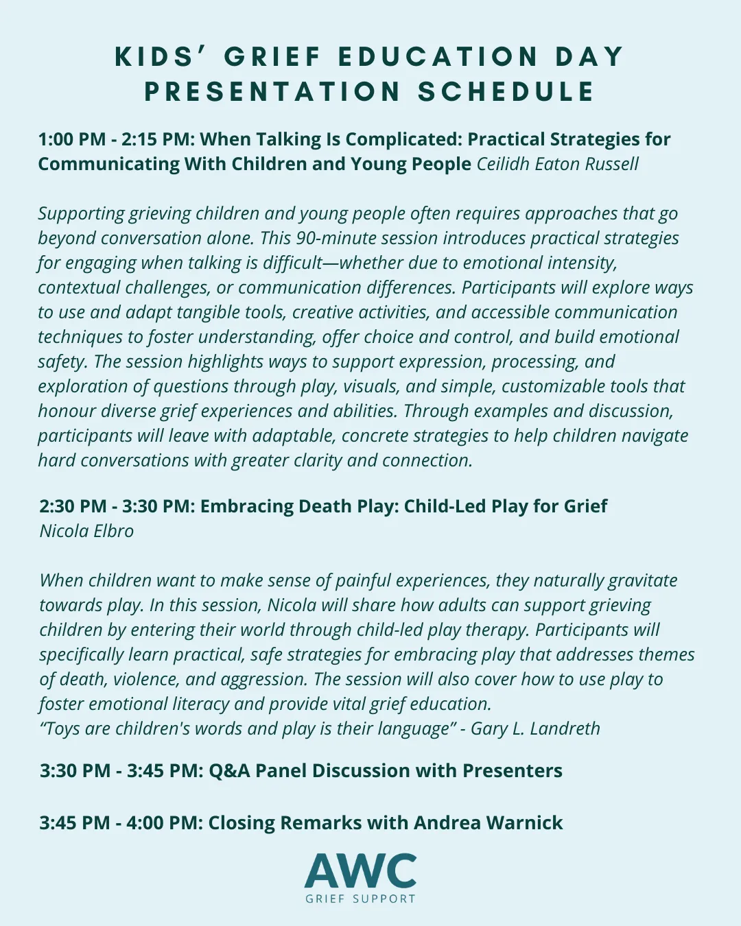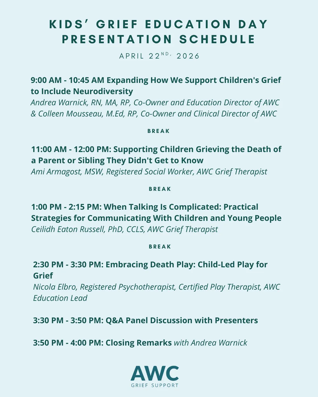 In this day-long workshop, Andrea Warnick, Colleen Mousseau, and other grief therapists from the AWC team will share innovative strategies and resources that can be used to support children who are grieving the dying or death of someone in their life. Practical tips, tools, and approaches will be shared for both those who have brief encounters with grieving children and those who play an ongoing role in their lives.
